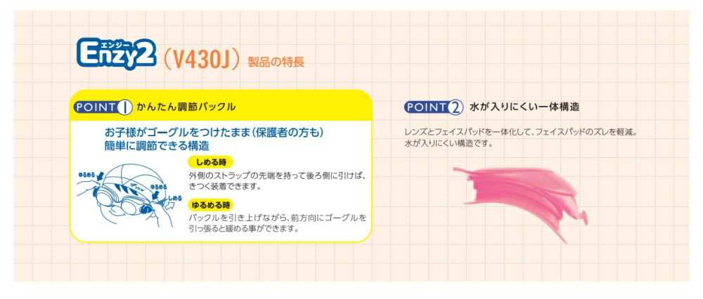 他の画像を見る 3~5歳でも簡単にストラップ調節 ラチェット式バックルのゴーグル VIEW ビュー クッション付き スイミングゴーグル ノーマルタイプ ジュニア用 Enzy2 エンジー2 V430J 定価 ¥ 1,430 のところ 当店特別価格 ¥ 1,155 税込 ★カートに入れる★ お気に入りに登録する